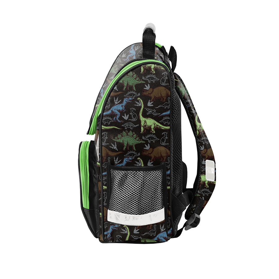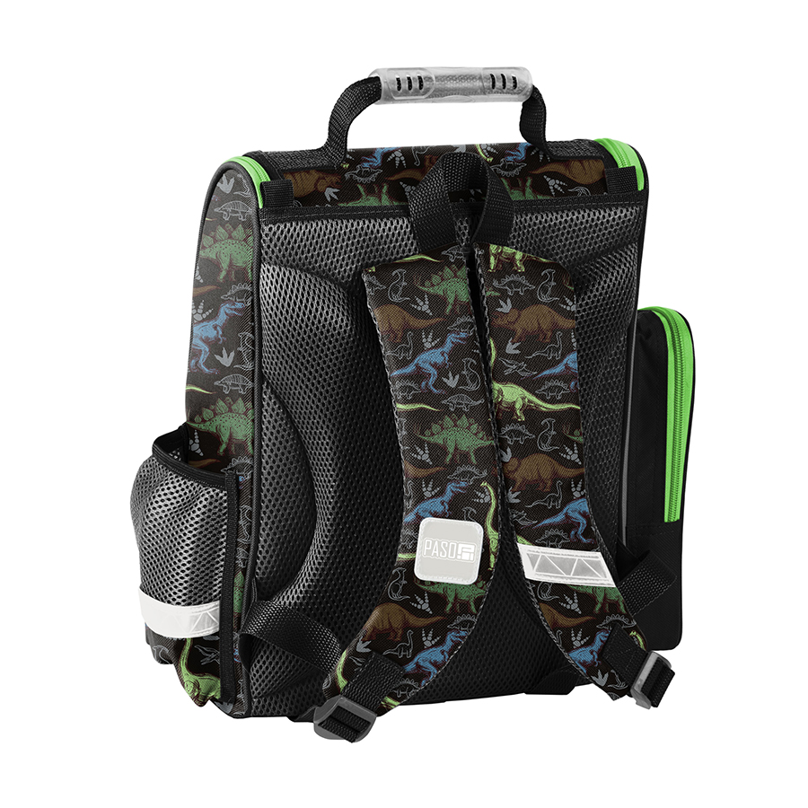 Tornister szkolny Dino Paso. Posiada jedną obszerną komorę, zapinaną na zamek dwukierunkowy z ozdobnymi pullerami ułatwiającymi zamykanie. Wewnątrz znajdują się przegrody, które pomogą dziecku utrzymać stały porządek wśród zapakowanych przedmiotów. Na przodzie tornistra funkcjonalna, zapinana na zamek kieszeń. Po bokach dwie kieszonki, jedna z siatki idealna na bidon lub butelkę, druga zapinana na zamek. Ergonomicznie ukształtowane, sztywne plecy w odczuwalny sposób odciążają kręgosłup małego właściciela. Miękkie, regulowane i wyprofilowane szelki odpowiadają za właściwą i zdrową posturę Twojego dziecka. Tornister posiada usztywniony spód oraz elementy odblaskowe.