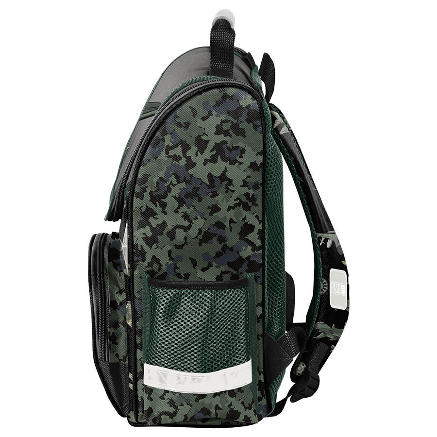 Na przedniej części tornistra znajduje się praktyczna kieszeń zapinana na zamek, a po bokach dwie dodatkowe kieszonki – jedna z siatki, doskonała do przechowywania bidonu lub butelki, a druga materiałowa zapinana na zamek. Ergonomicznie zaprojektowane, sztywne plecy tornistra zapewniają wsparcie dla kręgosłupa, co jest niezwykle istotne dla młodego użytkownika.