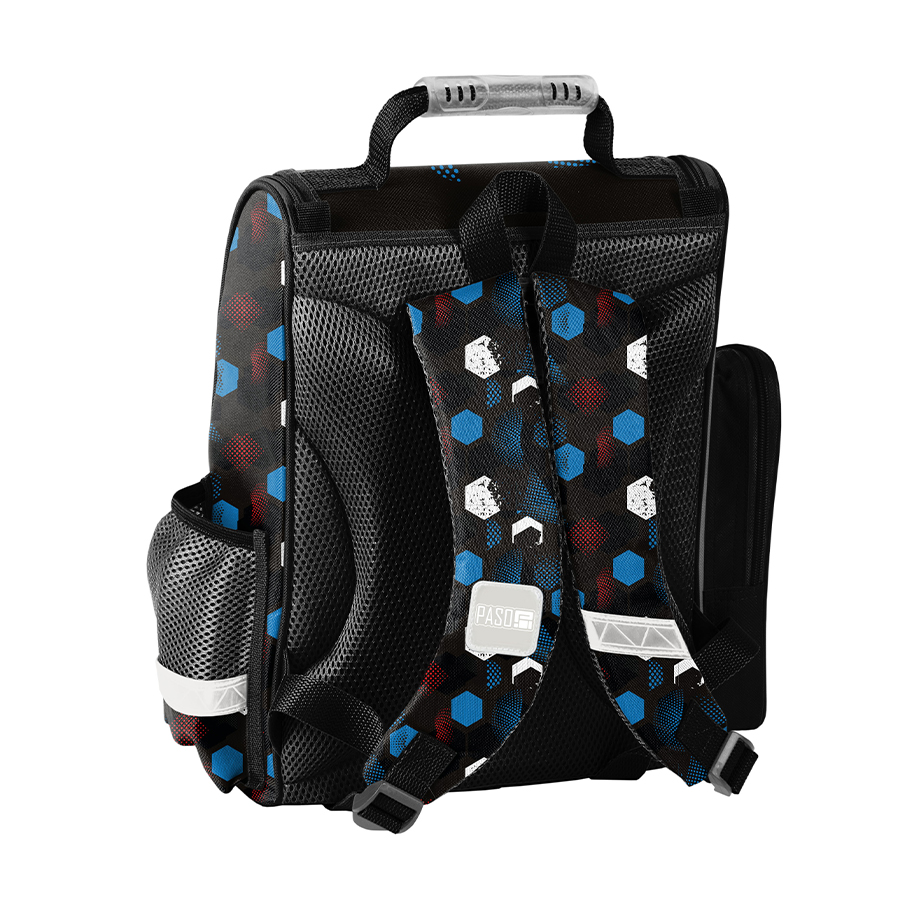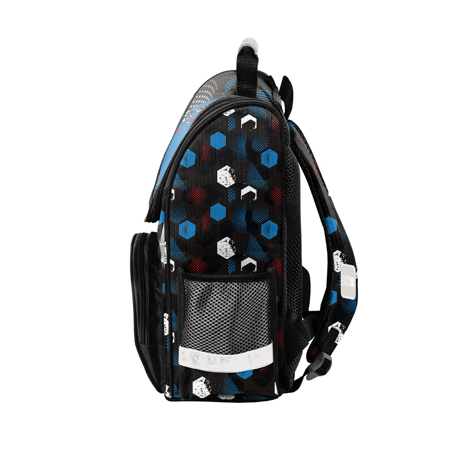Na froncie tornistra znajduje się praktyczna kieszeń, która zamyka się na zamek, a z boku znajdują się dwie dodatkowe kieszonki – jedna z siateczki, świetna na bidon lub butelkę, a druga na zamek. Plecy tornistra są sztywne i ergonomiczne, co skutecznie odciąża kręgosłup dziecka.