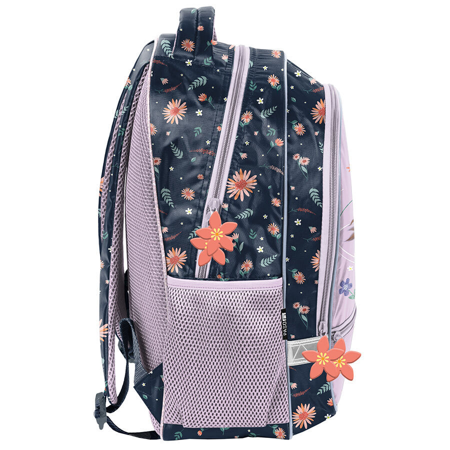 Tornister szkolny Kraina lodu charakteryzuje się jedną obszerną komorą, która jest zapinana na dwukierunkowy zamek, wyposażony w ozdobne pullery ułatwiające jego zamykanie. Wnętrze tornistra zawiera przegrody, które umożliwiają dziecku utrzymanie porządku wśród przechowywanych przedmiotów. Na przedniej części tornistra znajduje się funkcjonalna kieszeń, zapinana na zamek. Po bokach tornistra umieszczono dwie kieszonki: jedna z siatki, idealna do przechowywania bidonu lub butelki, a druga zapinana na zamek. Ergonomicznie ukształtowane, sztywne plecy stanowią wsparcie dla kręgosłupa młodego użytkownika. Miękkie, regulowane oraz wyprofilowane szelki zapewniają prawidłową i zdrową postawę ciała dziecka. Tornister wyposażony jest w usztywniony spód oraz elementy odblaskowe, co zwiększa jego funkcjonalność i bezpieczeństwo.