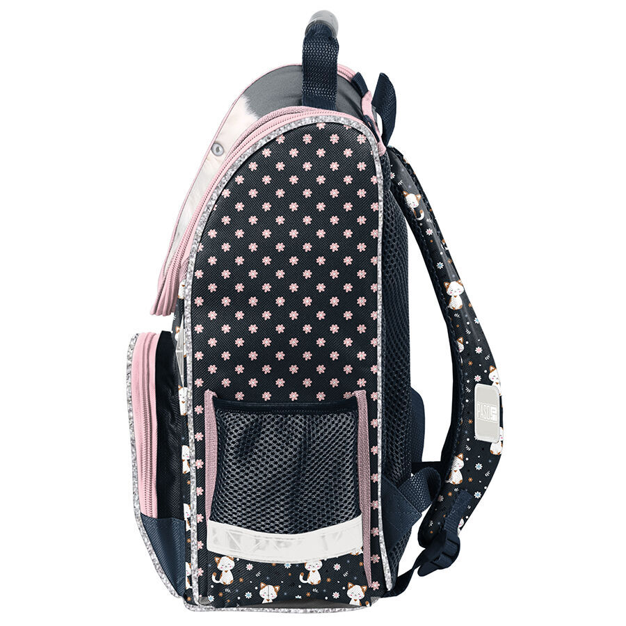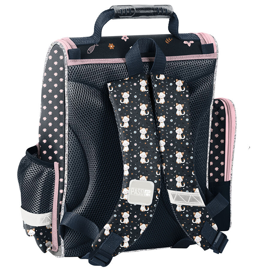 Tornister szkolny Little white cat charakteryzuje się jedną obszerną komorą, która jest zapinana na dwukierunkowy zamek, wyposażony w ozdobne pullery ułatwiające jego zamykanie. Wnętrze tornistra zawiera przegrody, które umożliwiają dziecku utrzymanie porządku wśród przechowywanych przedmiotów. Na przedniej części tornistra znajduje się funkcjonalna kieszeń, zapinana na zamek. Po bokach tornistra umieszczono dwie kieszonki: jedna z siatki, idealna do przechowywania bidonu lub butelki, a druga zapinana na zamek. Ergonomicznie ukształtowane, sztywne plecy stanowią wsparcie dla kręgosłupa młodego użytkownika. Miękkie, regulowane oraz wyprofilowane szelki zapewniają prawidłową i zdrową postawę ciała dziecka. Tornister wyposażony jest w usztywniony spód oraz elementy odblaskowe, co zwiększa jego funkcjonalność i bezpieczeństwo.