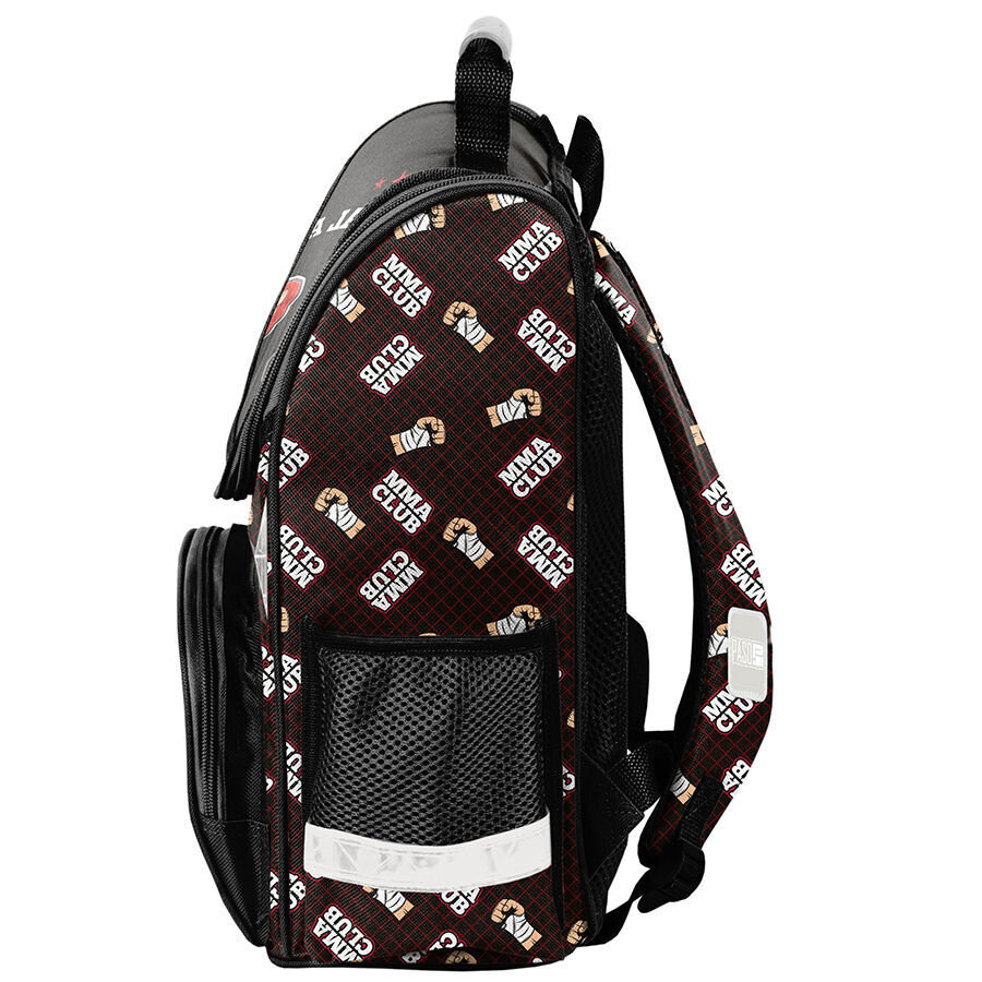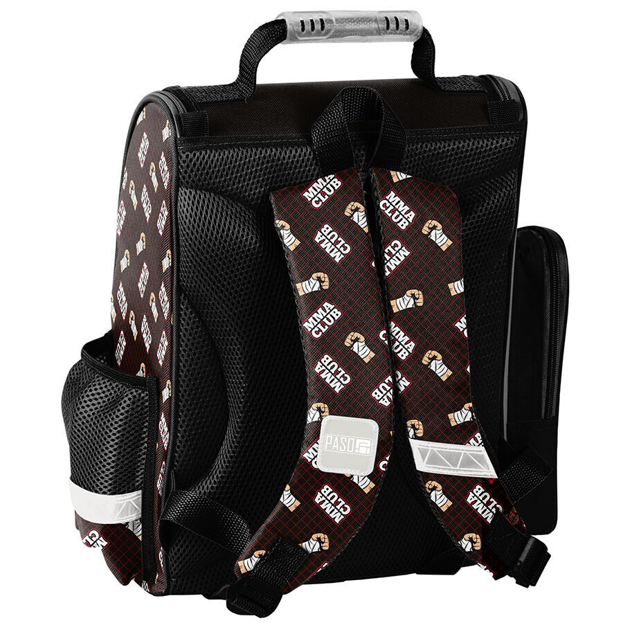 Tornister szkolny MMA Club to idealny towarzysz dla młodego ucznia. Posiada jedną dużą komorę, zamykaną na dwukierunkowy zamek, którego ozdobne pullery sprawiają, że zamykanie jest niezwykle proste. Wewnątrz tornistra znajdują się praktyczne przegrody, które pomogą dziecku w zachowaniu porządku wśród wszystkich potrzebnych przedmiotów. Z przodu tornistra umieszczona jest funkcjonalna kieszeń zapinana na zamek, a po bokach znajdują się dwie dodatkowe kieszonki – jedna z siatki, idealna na bidon lub butelkę, a druga z materiału także zapinana na zamek.