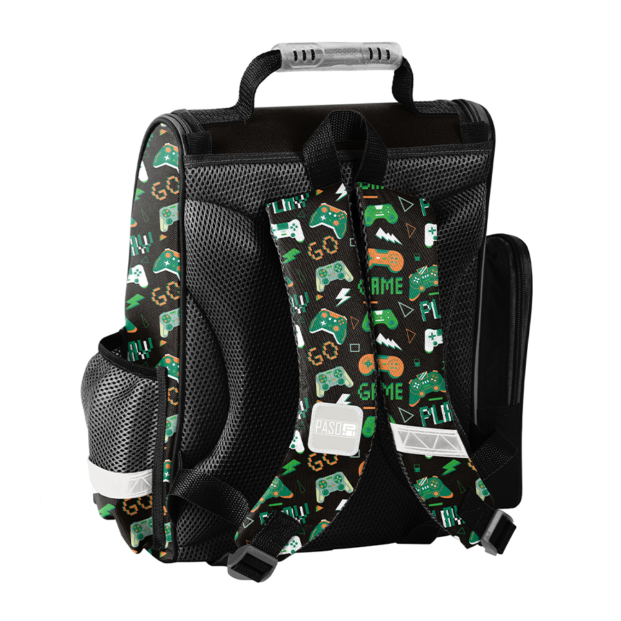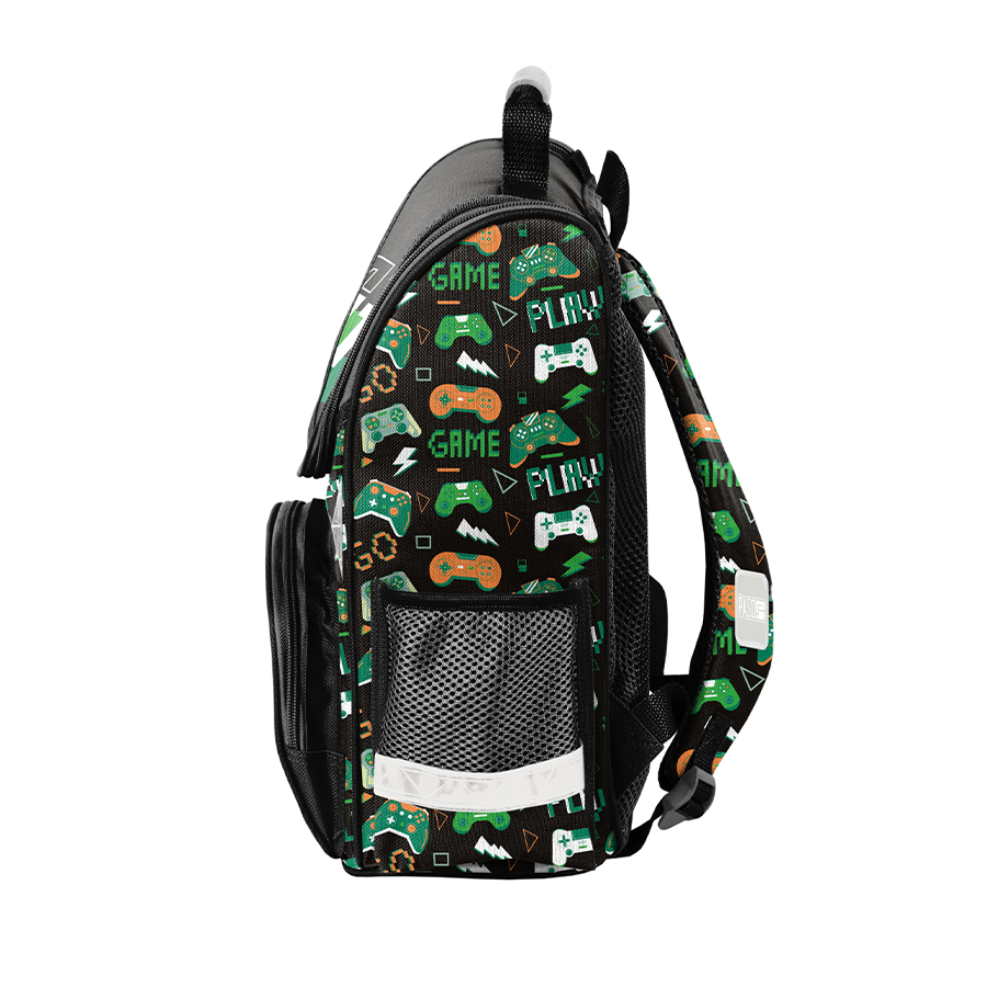 Z przodu tornistra znajduje się praktyczna kieszeń zapinana na zamek, a po bokach umieszczono dwie dodatkowe kieszonki – jedna siatkowa, idealna na bidon lub butelkę, a druga zamykana na zamek. Ergonomicznie ukształtowane, sztywne plecy skutecznie odciążają kręgosłup małego właściciela.