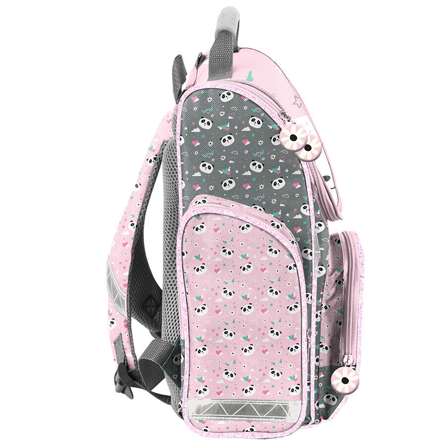 Tornister szkolny z motywem Panda with love. Wyposażony jest w jedną pojemną komorę, która jest zamykana na dwukierunkowy zamek, posiadający ozdobne pullery, co ułatwia jego obsługę. Wewnątrz tornistra znajdują się przegrody, które pomogą dziecku w utrzymaniu porządku wśród przechowywanych przedmiotów. Na przedniej części tornistra znajduje się praktyczna kieszeń, z zamkiem błyskawicznym. Po bokach umieszczono dwie kieszonki: jedna z siatki, idealna do przechowywania bidonu lub butelki, a druga zapinana na zamek. Ergonomicznie ukształtowane, sztywne plecy skutecznie odciążają kręgosłup młodego użytkownika. Miękkie, regulowane i profilowane szelki zapewniają prawidłową i zdrową postawę dziecka. Tornister posiada również usztywniony spód oraz elementy odblaskowe, zwiększające bezpieczeństwo użytkowania.