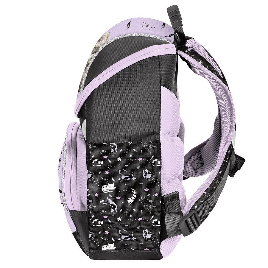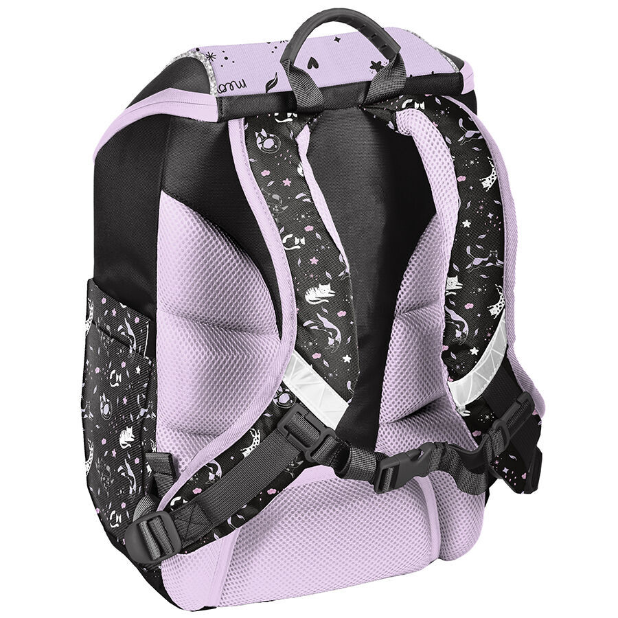 Tornister szkolny premium Striped cat. Posiada jedną pojemną komorę zapinaną na zamek z dwiema wewnętrznymi przegrodami. Model wzbogacony o ozdobne pullery ułatwiające zamykanie. Front tornistra wyposażono w funkcjonalną, zapinana na zamek kieszeń. Po bokach dwie materiałowe kieszonki na gumce. Ergonomicznie ukształtowane plecy w odczuwalny sposób odciążają kręgosłup małego właściciela. Miękkie, regulowane i wyprofilowane szelki z pasem piersiowym odpowiadają za właściwą i zdrową posturę dziecka. Tornister posiada wzmocniony spód, wygodny uchwyt do przenoszenia oraz elementy odblaskowe.
