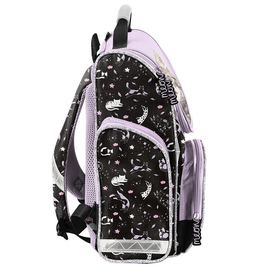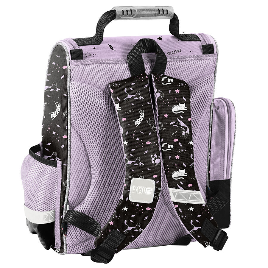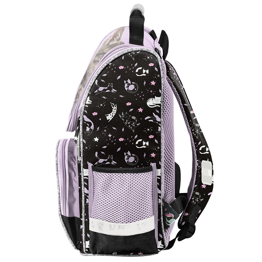 Tornister szkolny Striped cat charakteryzuje się jedną obszerną komorą, zamykaną za pomocą dwukierunkowego zamka, który został wyposażony w ozdobne pullery, ułatwiające zamykanie. Wewnątrz tornistra znajdują się przegrody, które umożliwiają dziecku utrzymanie porządku wśród przechowywanych przedmiotów. Z przodu tornistra znajduje się funkcjonalna kieszeń, zamykana na zamek, natomiast po bokach umieszczono dwie kieszonki: jedna z siatki, idealna do przechowywania bidonu lub butelki, a druga z materiału zamykana na zamek. Ergonomicznie ukształtowane, sztywne plecy tornistra w znaczący sposób odciążają kręgosłup młodego użytkownika. Miękkie, regulowane oraz wyprofilowane szelki przyczyniają się do utrzymania właściwej i zdrowej postawy dziecka. Tornister wyposażony jest także w usztywniony spód oraz elementy odblaskowe, zwiększające bezpieczeństwo użytkowania.