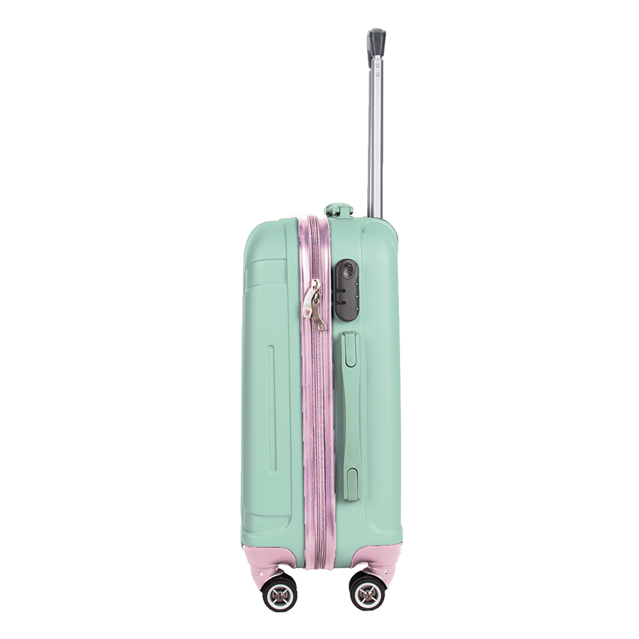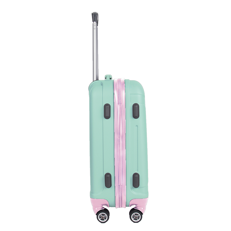 Lekka walizka na czterech kółkach obrotowych. Wykonana z twardego odpornego na zarysowania tworzywa ABS. Jedna część zamykana przegrodą z dodatkowymi kieszonkami, druga część zabezpieczana pasami spinającymi. Wygodna rączka, stelaż wewnętrzny, zamek szyfrowy. Dwa wygodne uchwyty do przenoszenia górny i boczny.