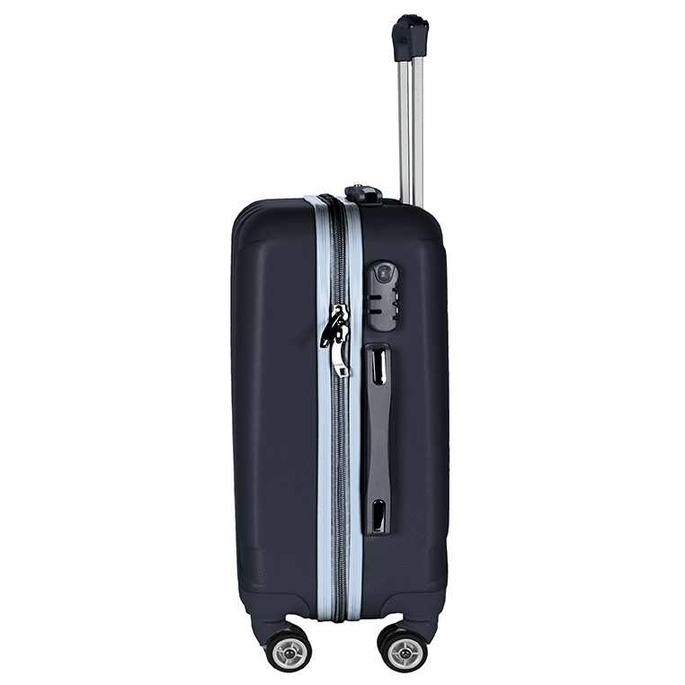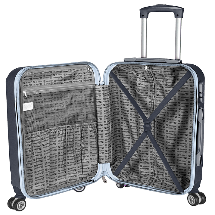 Lekka walizka na czterech kółkach obrotowych. Wykonana z twardego odpornego na zarysowania tworzywa ABS. Jedna część zamykana przegrodą z dodatkowymi kieszonkami, druga część zabezpieczana pasami spinającymi. Wygodna rączka, stelaż wewnętrzny, zamek szyfrowy. Dwa wygodne uchwyty do przenoszenia górny i boczny.