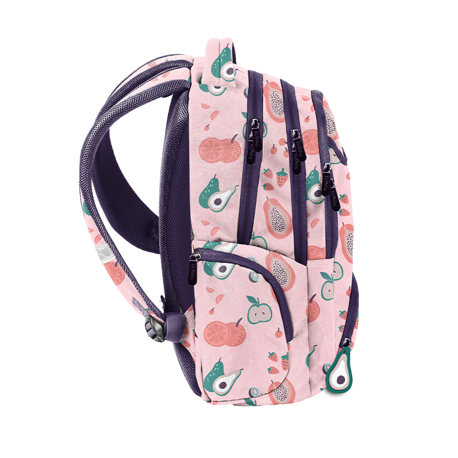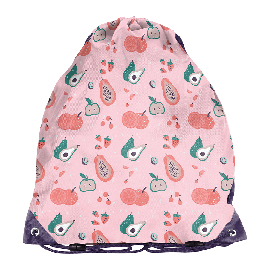 Worek na obuwie Fruit. Jednokomorowy worek o szerokim zastosowaniu. Świetnie sprawdzi się jako worek na obuwie, strój gimnastyczny lub drobny plecaczek. Model zamykany jest podwójnym ściągaczem, dzięki czemu dostęp do zawartości jest łatwy i szybki. Sznurki wyposażone zostały w przerywacze zapewniające bezpieczeństwo w przypadku splątania. Podwójne sznureczki umożliwią noszenie worka na plecach lub na ramieniu.