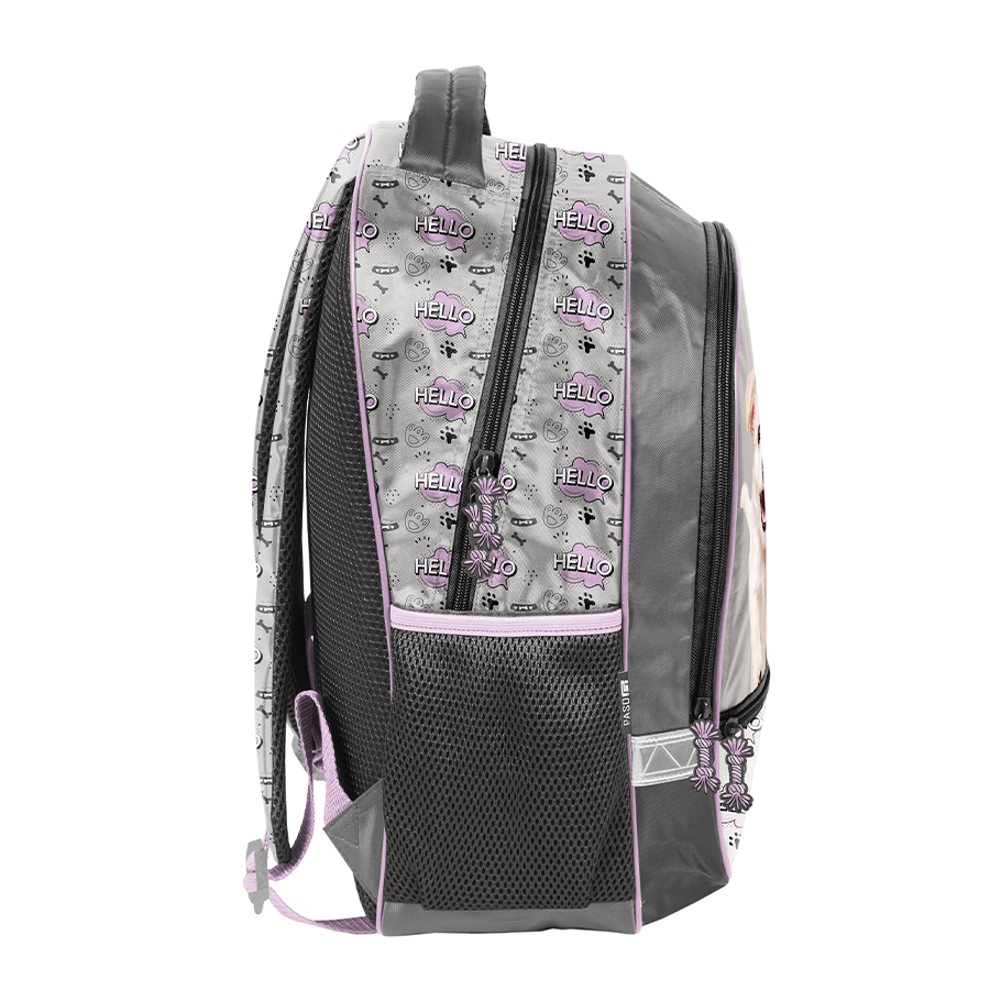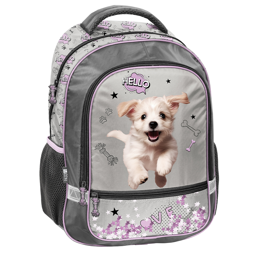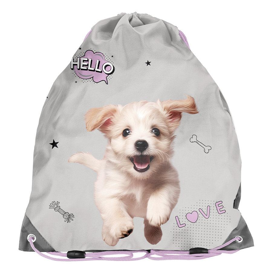 Worek na buty Hello Puppie. Bardzo lekki wyrób o różnorodnych możliwościach wykorzystania. Pojemna komora główna z zamknięciem na podwójny ściągacz umożliwi łatwy dostęp do zawartości. Sznurki zostały zaopatrzone w przerywacze, które gwarantują bezpieczeństwo w razie splątania. Podwójne sznureczki pozwolą na noszenie torby na plecach lub na ramieniu. Model stworzony jest do przechowywania butów, odzieży sportowej lub akcesoriów jako mały plecaczek.