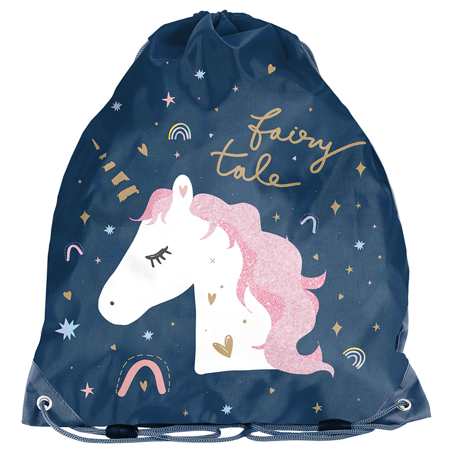 Zestaw szkolny Jednorożec, w którego skład wchodzi plecak, worek na obuwie, piórnik bez wyposażenia, śniadaniówka i bidon.